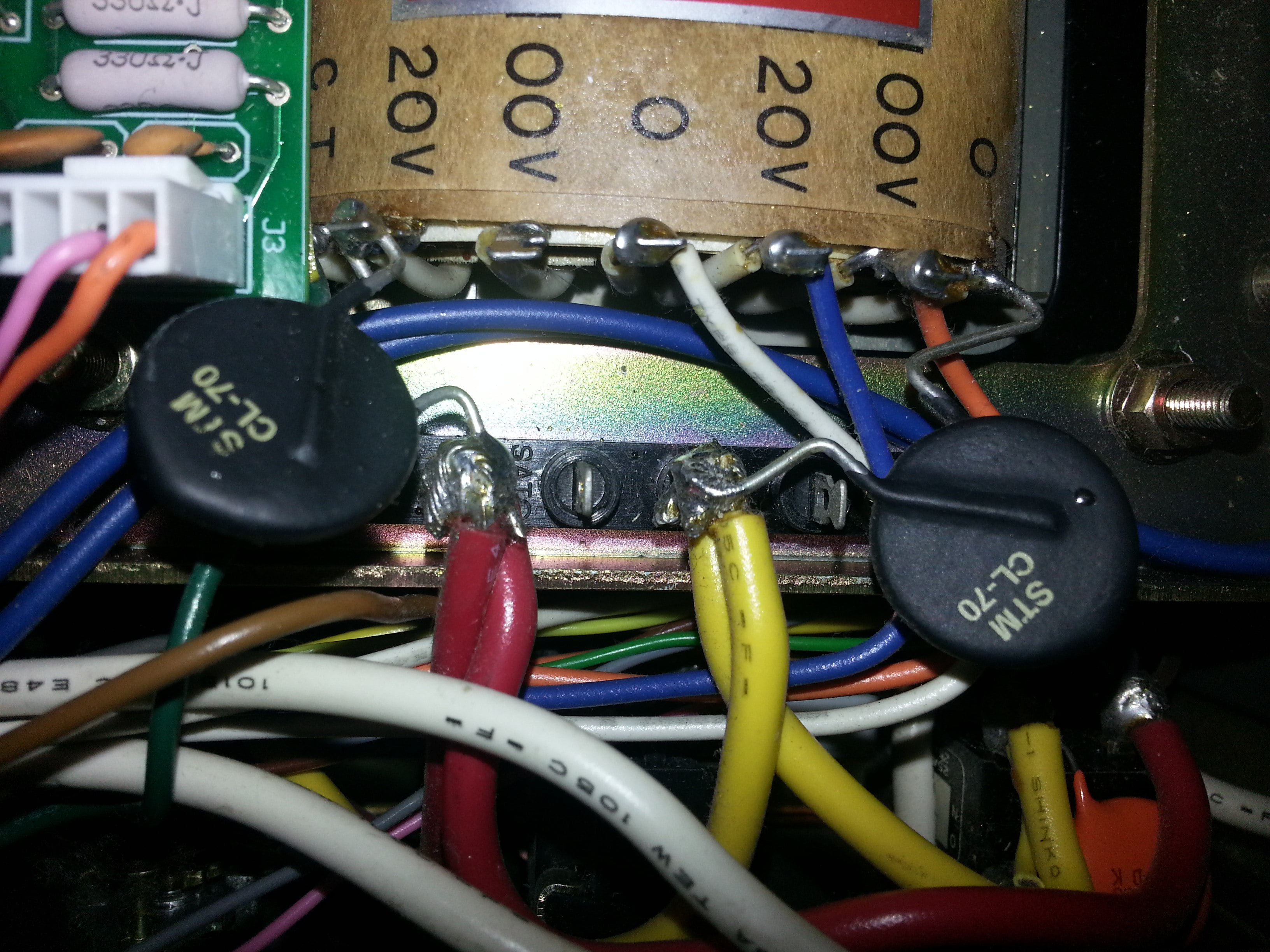 Sur le primaire du transfo « filament » j’ai inséré des thermistances CL-70 qui limitent le courant d’appel.