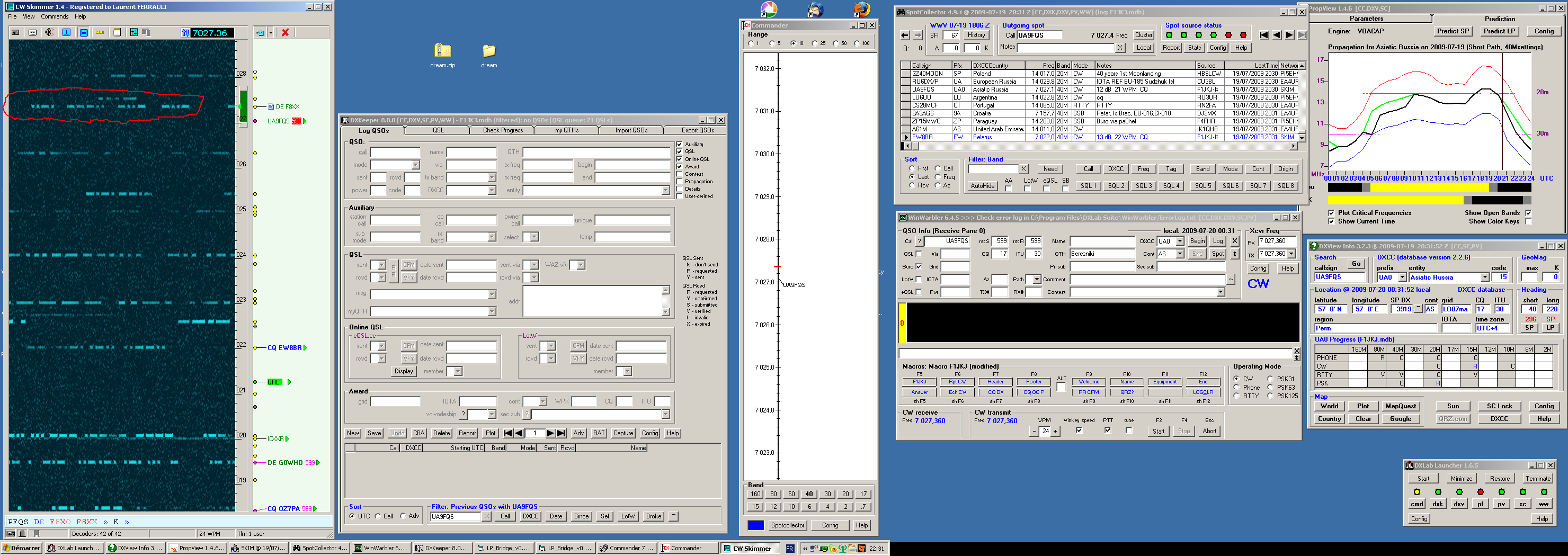 J’ai envoyé hier cette capture d’écran à André F8XX, que mon skimmer avais « repéré » dans la bande CW. Et puis ce matin je me dis que je devrais la mettre sur le blog, pour vous montrer à quoi ressemble mon espace de travail informatique lorsque je suis à la station en fonctionnement CW  avec le Skimmer.
