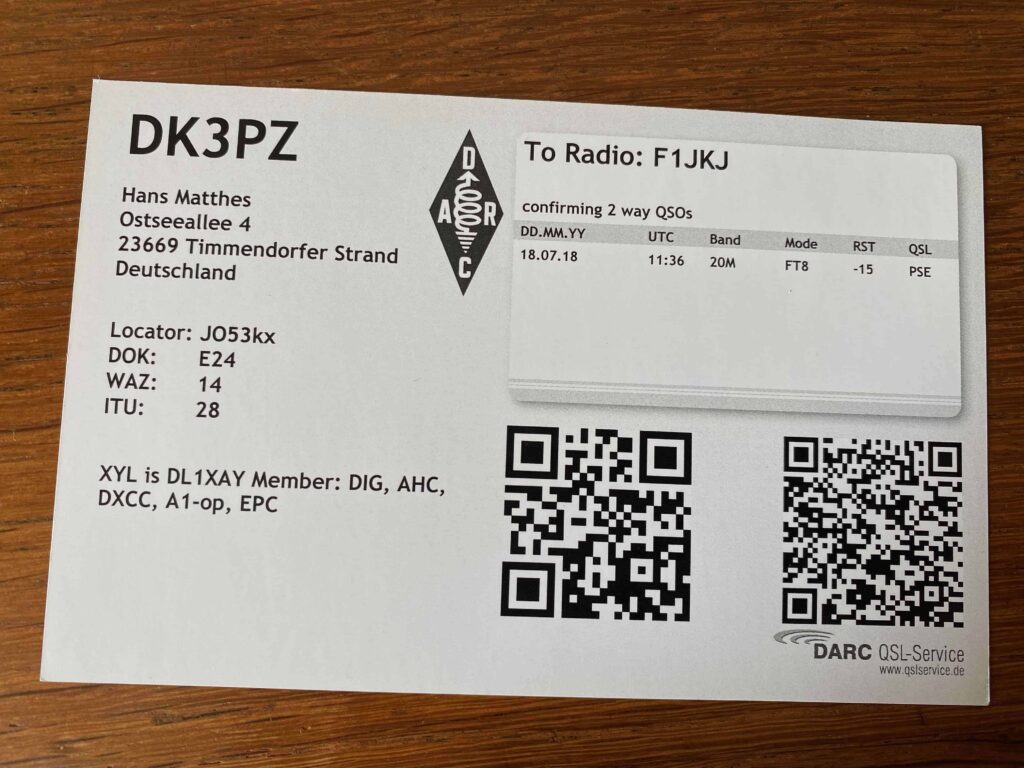 Hé bien non ! Désormais, les cartes imprimées par le « QSL service » du DARC intègrent les codes en question ! Regardez cette carte reçue récemment: