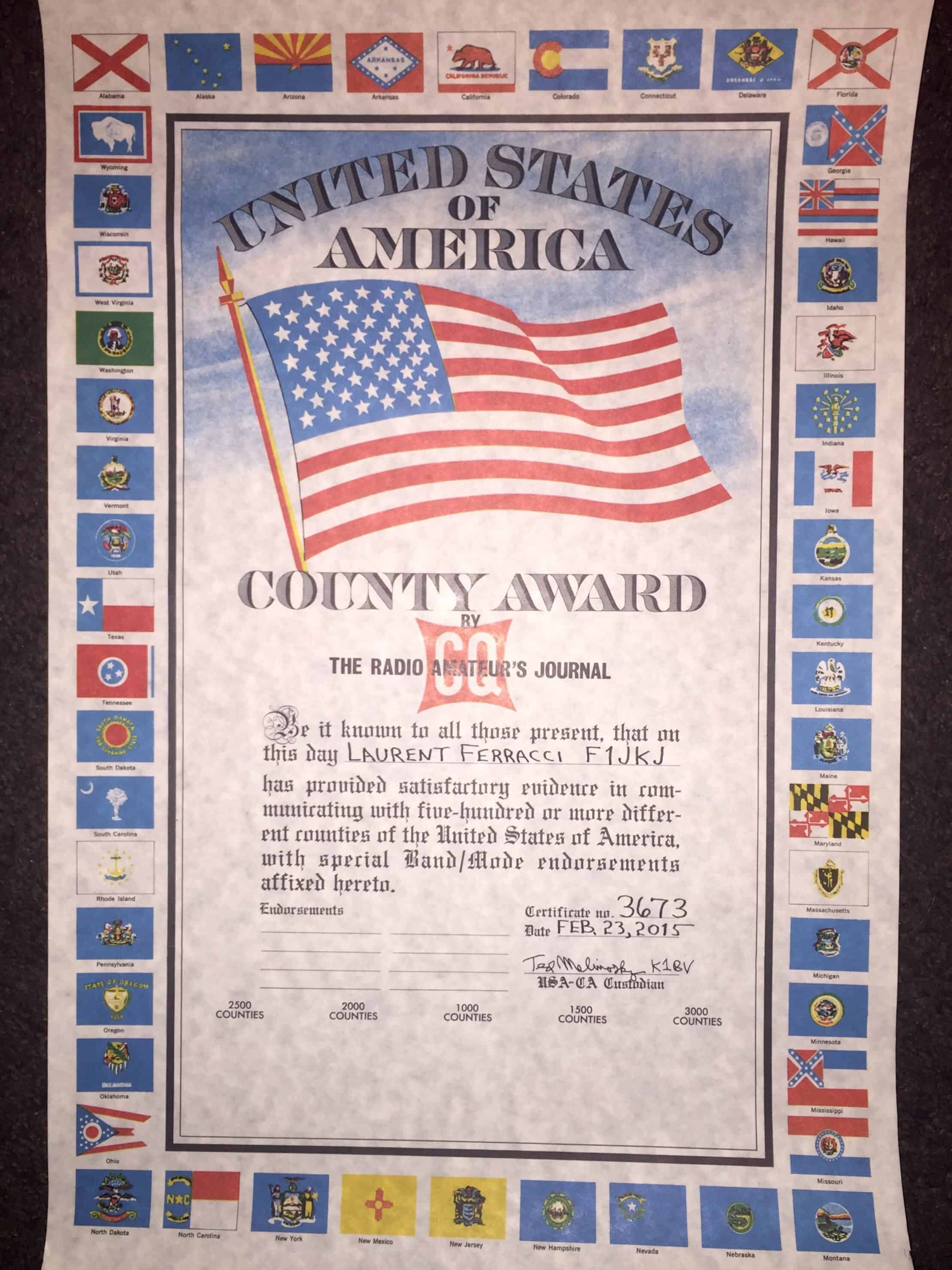 Avec un peu plus de 1000 comtés contactés je dépasse un peu les 500 confirmés. C’est le seuil d’entrée pour l’USA-CA décerné par le magazine CQ.
